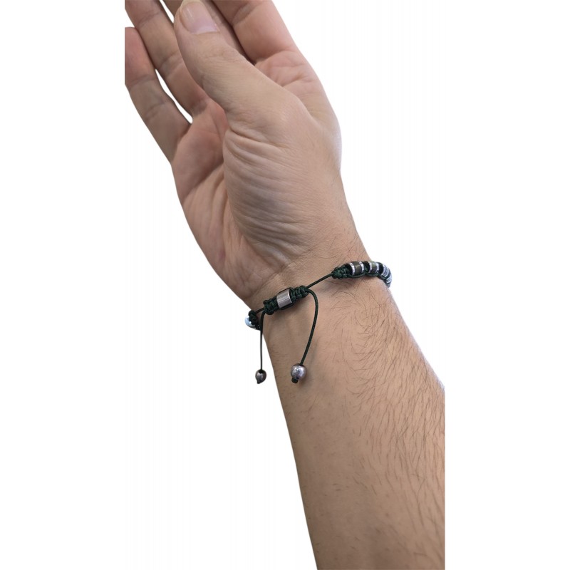 Örme bilekliktir. Hematit taşı ve Jade (yeşim taşı ) kullanılmıştır. Doğanın huzurunu temsil eden yeşim taşı ile gücün sembolü Hematit taşı'nın birleşimi .. Denge , odak ve güçlü bir stili bilekte yansıtıyor.